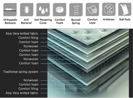 ორთოპედიული, ანტიბაქტერიული, ნესტგამძლე, კომფოტული ქაფი, ანტისტრეს ფენები.
